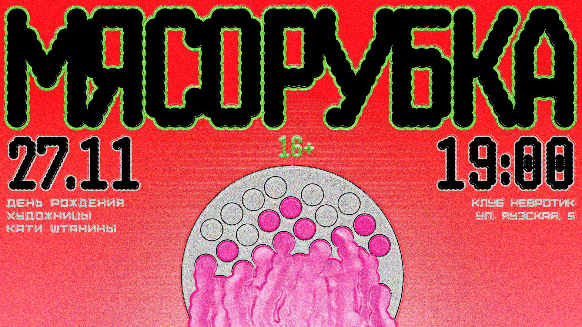 В этот праздничный четверг вас ждет гурманское приключение! Самые разные музыканты сложатся в единый механизм нашей мясорубки и смешают все ингредиенты в пестрый фарш. Под конец став единой и сочной котлетой. Звонкой перчинкой в нашем блюде станут работы свежей и пряной художницы Кати Штанины.